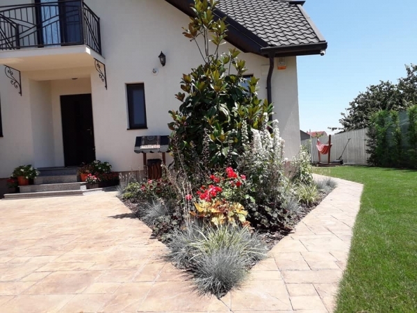 Plantari arbori, arbusti si flori. Gazonul, pietrisul decorativ/pavajul, formele geometrice create de acestea sunt excelent puse in evidenta prin prezenta unui arbore solitar, aranjamente de arbusti decorativi si flori, plante perene si de sezon.